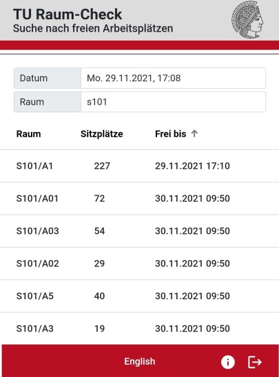 Wenn Sie einen Arbeitsplatz auf dem TU -Campus benötigen, dürfen Sie dafür freie zentrale Räume an der TU nutzen. Diese können Sie mit der Anwendung „TU Raum-Check“ ausfindig machen:
