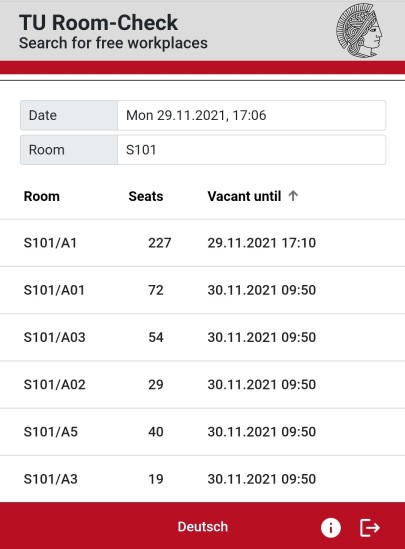 If you need a workstation on the TU-Campus, you are allowed to use free central rooms for this purpose. You can find these with the application “TU Raum-Check”: