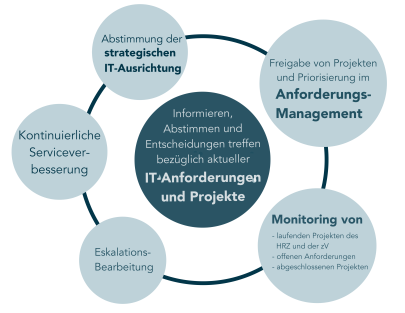 Die IT-Koordination HRZ-ZV unterstützt die IT-Weiterentwicklung / Digitalisierung von Verwaltungsprozessen (IT-Governance) durch das regelmäßige Abstimmen und Monitoring der Fortschritte und Entwicklung von IT-Anforderungen und IT-Projekten. Es ist ein wichtiger Bestandteil im Anforderungs- und Projektmanagement von zV und HRZ. Gemeinsam werden Entscheidungen für die in der zV vorpriorisierten IT-Anforderungen gefällt, bspw. zur abgestimmten Priorität, Umsetzungsreihenfolge.