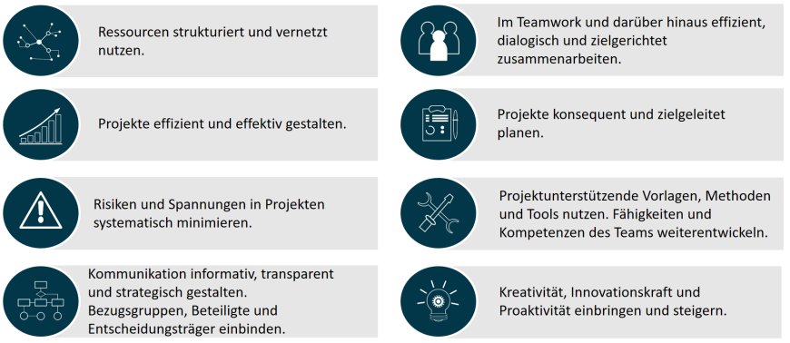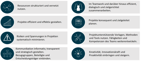 An dieser Stelle soll besonders auf den „Lessons Learned“-Aspekt hingewiesen werden. Zum Projektabschluss wird das Projekt auf soziale, kommunikative und Team-Kompetenzen hin beleuchtet und kann durch einen Workshop ergänzt werden, um aus dem Projekt zu lernen.