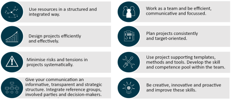 At this point, special reference should be made to the “lessons learned” aspect. At the end of the project, the project is examined in terms of social, communication and team competencies and can be supplemented by a workshop to learn from the project.