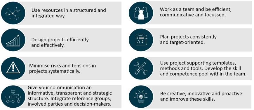 In a first step, we start with a classical project phase model. This is a jointly agreed-upon framework that gives all parties involved in the project confidence to act. At the same time, it is and should be possible to work in all phases with an agile mindset, such as Kanban. The University Administration’s project management will be improved gradually by adding creative and agile methods for instance that will make it possible to reach the objectives listed below.