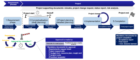 The graphic shows the process flow of a project starting from the requirements process to project completion and which forms are needed for the transition between the phases. The iterative definition of the requirements culminates in the implementation of the project after approval.
